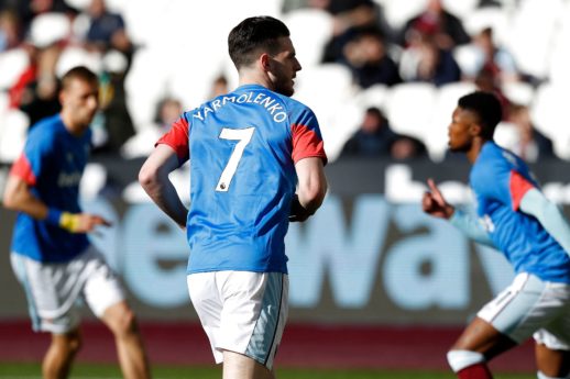 Forud for kampen mellem West Ham og Wolverhampton holdt West Ham-anfører Declan Rice sin holdkammerat Andriy Yarmolenkos trøje op foran kameraet. Den ukrainske landsholdsanfører har
