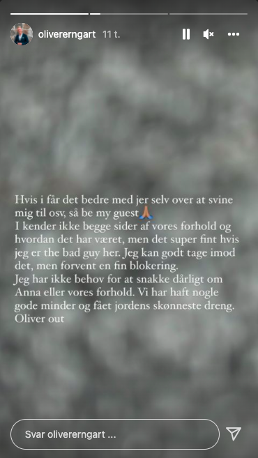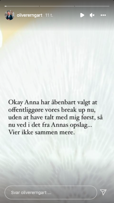 Oliver har også kommet med en udtalelse omkring sit breakup med Anna, men har været noget mere kortfattet. I hans opslag skriver han følgende.
