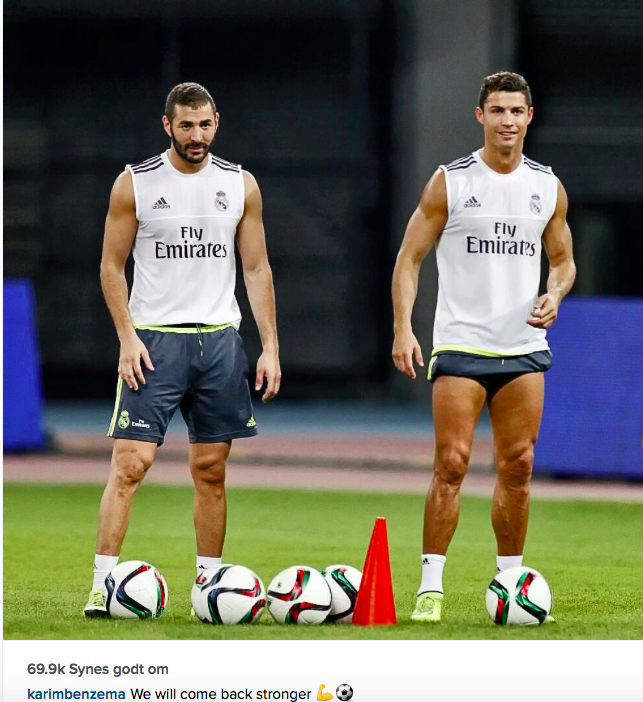 I dag kom det frem, at Karim Benzema og Cristiano Ronaldo ikke er taget med resten af Real Madrid-truppen til Tyskland, hvor Real Madrid de næste par dage deltager i Audi Cup. De er nemlig begge skadet, men Benzema lover på Instagram, at han og Ronaldo vender stærkere tilbage.