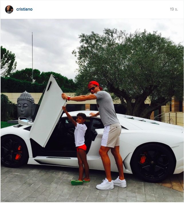 Tidligere i dag smed vi et billede op, hvor Cristiano Ronaldo poserede foran sin Rolls Royce Phantom, hvilket du kan se her. Nu har han så smidt et andet billede op, hvor han og sønnike poserer foran hans lækre Lamborghini Aventador, der koster over 2 millioner.
