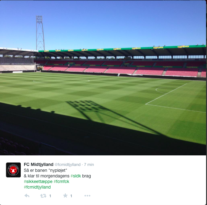 I morgen venter der en tidlig gulddyst i Alka Superligaen, når FC Midtjylland tager i mod FC København. Forud for braget er banen på MCH Arena blevet klippet, så den nu står knivskarpt. Se det på billedet herunder.