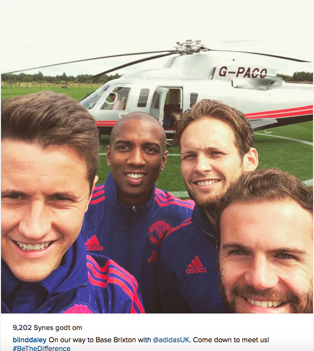 Der følger visse forpligtelser med, når man er professionel fodboldspiller. En af dem er at møde op til arrangementer, som bliver arrangeret af den producent, som nu sponsorerer spilleren. Det er heller ikke så galt, når man bliver fløjet afsted i helikopter. Og det gør Daley Blind, Ashley Young, Juan Mata og Ander Herrera, når de i dag skal møde op til et Adidas-arrangement i Brixton.