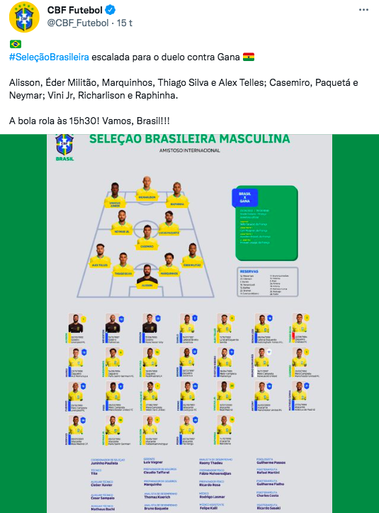 Den brasilianske startopstilling bød på flere prominente navne, hvilket kan ses på nedenstående Twitter-opslag af det brasilianske fodboldforbund, CBF Futebol:
