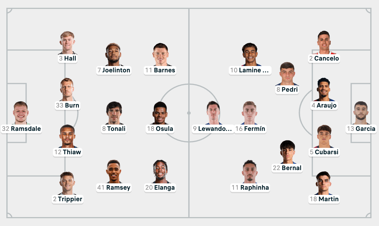 Du kan se både Newcastle og FC Barcelonas startopstillinger herunder: