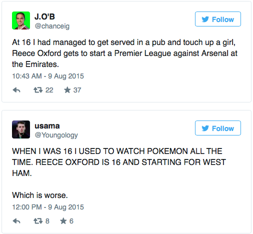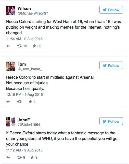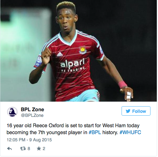 West Ham og Slaven Bilic indleder i dag sæsonen med en svær udekamp i mod Arsenal. Manageren tager i kampen noget af en chance, da han i følge Daily Mail giver den blot 16-årige Reece Oxford chancen på midten. I den forbindelse har vi herunder samlet de bedste tweets.