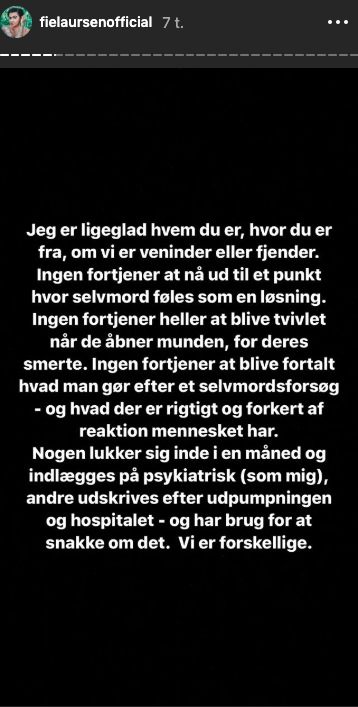 I et langt opslag på Instagram, har hun åbnet op for sine tanker både før og efter episoden, og understreger også, at hun har søgt hjælp nu, i håbet om at få det bedre i fremtiden. Det opslag har gjort indtryk på rigtig mange mennesker, herunder Fie Laursen.