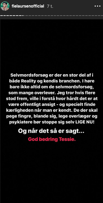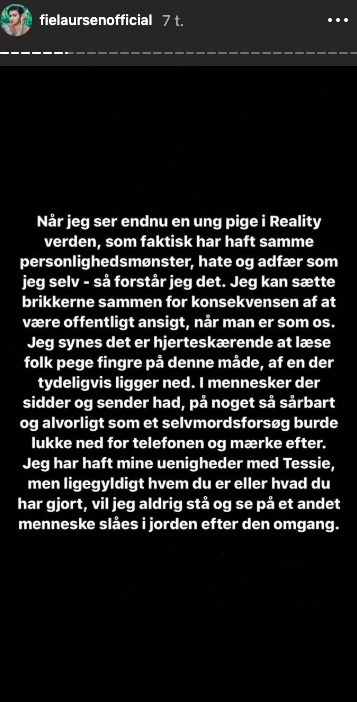 Fie Laursen har ligesom Tessie, nemlig oplevet, hvordan det er at få så meget opmærksomhed og hate på de sociale medier, og generelt i hverdagen. Derfor kunne hun i den grad, desværre nikke genkende til det mønster, som Tessie er gået igennem, og det har altså gjort indtryk. Igennem en lang besked, har Fie Laursen sendt sin støtte til Tessie i en svær tid, til trods for, at hun tidligere har haft sine uenigheder med Tessie.