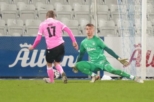OB-målmand Hans Christian Bernat så ikke specielt godt ud, da en halvflugter fra Kasper Høgh blev braget i hans retning – og ind i netmaskerne.