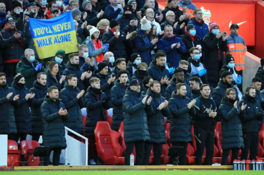 Smuk hyldest fra fansene på Anfield til Ukraine. Et minuts klapsalver til ære for Ukraine blev overdøvet af et fyldt Anfield som brød ud i