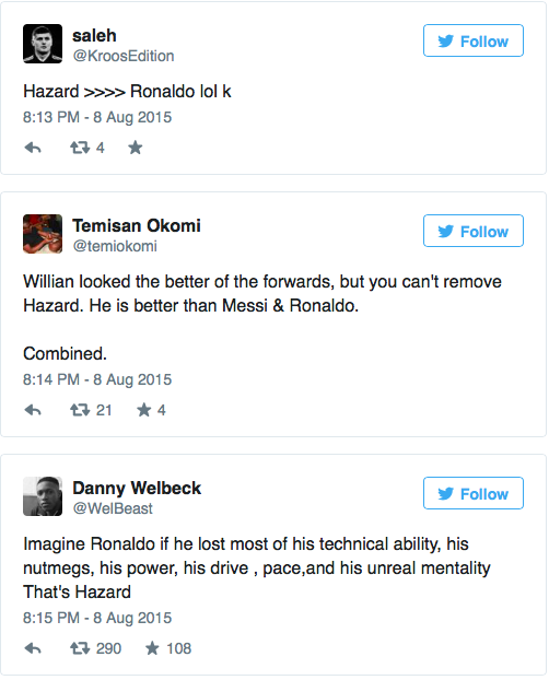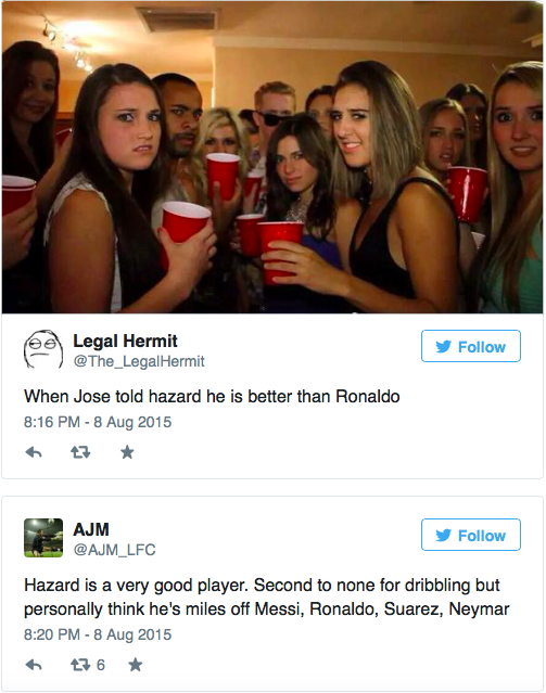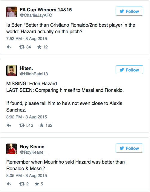José Mourinho kaldte forleden Eden Hazard en bedre spiller end Cristiano Ronaldo. Hazard kvitterede med at levere en skidt indsats i dagens kamp mod Swansea, og nu bliver sammenligningen med Ronaldo latterliggjort, mens Hazard bliver efterlyst på Twitter.