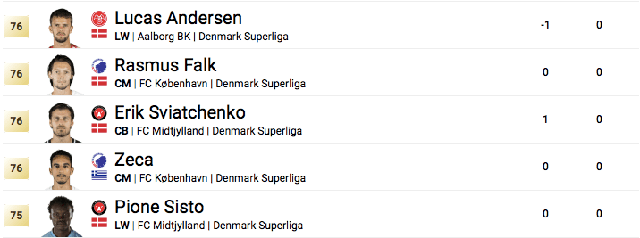 Lucas Andersen har en rating på 76 – det samme som Rasmus Falk, Erik Sviatchenko og Carlos Zeca, der alle er placeret under den aalborgensiske profil på den officielle liste.
