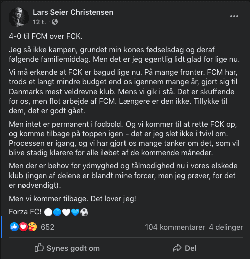 Således har han i et yderst ærligt opslag skrevet, at FC Midtjylland simpelthen er foran FC København på flere parameter.
