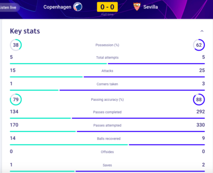 Hvis man skal sammenholde de første 45 minutter, kan man slutte, at halvlegen har været rimelig jævnbyrdig målt på afslutninger og chancer – dog med Sevilla mest på bolden.