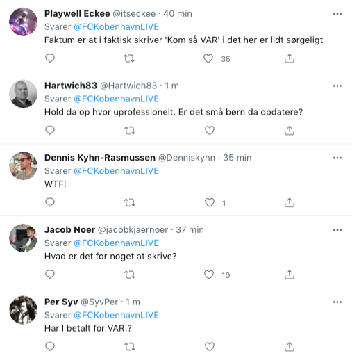 I løvernes liveopdatering af kampen skrev de nemlig ‘Kom så VAR’ i forbindelse med Brøndbys udligning – det til trods for, at målet blev scoret efter et hjørnespark, og der ikke var nogen forseelse.
