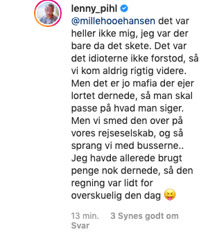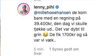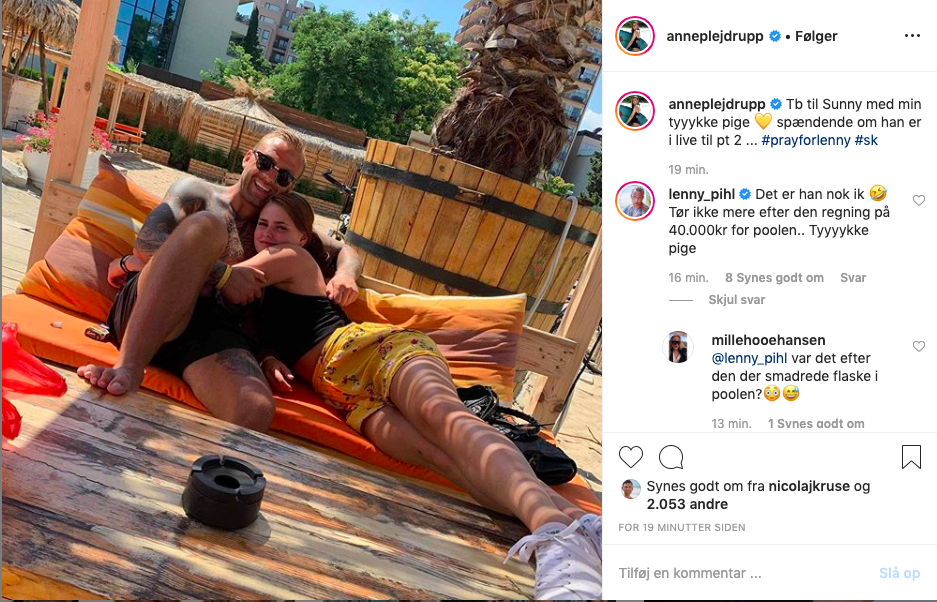 På Anne Plejdrups nyeste Instagram-billede, hvor man kan se Lenny og Anne, skriver hun i teksten, at hun håber Lenny er klar til en part 2 tur. Det er så her, at Lenny afslører, hvordan de fik stukket en regning på 40.000 kroner i hovedet af hotellet, og endte med at betale 1700 kroner og skred.