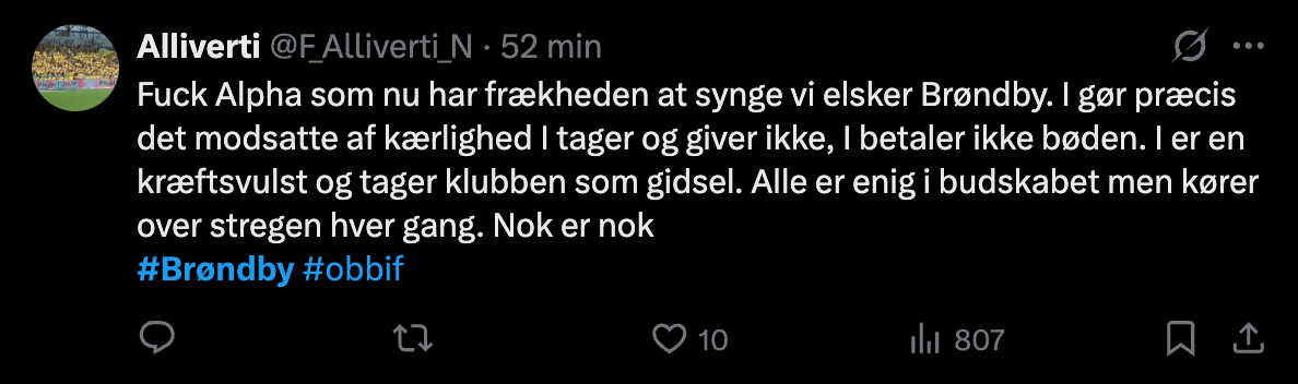 Derfor venter der med stor sandsynlighed de blå-gule fra Vestegnen endnu en stor bøde i den nærmeste fremtid, og det har fået flere BIF-fans til tasterne på det sociale medie X, hvor de udtrykker stor utilfredshed med opførslen på lægterne.