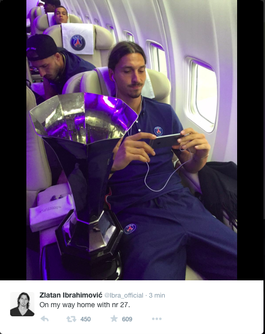 I går sikrede Zlatan sig nemlig sit trofæ nummer 27, da han sammen med Paris Saint-Germain vandt den franske Super Cup efter en 2-0-sejr over Olympique Lyon. Og det blev fejret med dette kølige billede på Twitter.