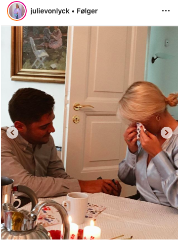 Det kom som det største chok og vildeste overraskelse, og jeg sagde selvfølgelig JA!! ? Elsker dig for evigt min skat Steffan Bak, skriver den lykkelige Julie på sin Instagram-profil.