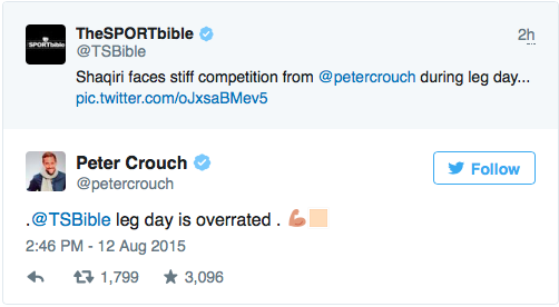 Peter Crouch har endnu engang leveret et fantastisk tweet. Denne gang hopper han med på joken om forskellen på hans og Shaqiris ben.